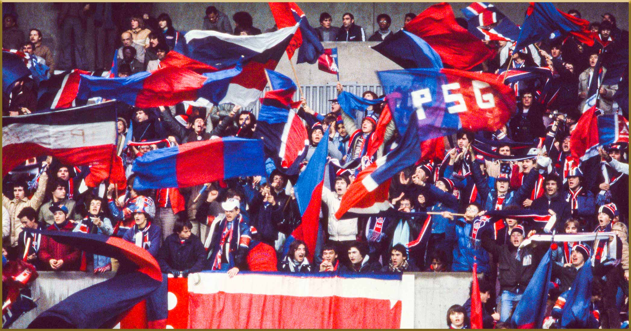 Ce jour-là, quand nous avons découvert le Parc des Princes de la rue, nous étions tous les deux des Christophe Colomb, des Magellan, des grands navigateurs, des aventuriers qui avaient accepté d’aller au stade sans savoir ce que c’était finalement. C’était l’aventure vers un nouveau monde, notre nouveau monde. Les odeurs de nourriture, d’oignons frits, de graillon, puis de cigares, la foule et puis notre déguisement, maillots Hechter RTL sur le dos, écharpes PSG BBRBB en laine autour du coup achetées aux vendeurs à la sauvette autour du stade, une crécelle en bois à la main et une corne de brume, d’ailleurs confisquée par un CRS ! Toutes ces marches à gravir avec l’excitation de l’inconnue qui grandissait. Qu’allions nous découvrir ? Pourquoi tous ces gens se précipitaient eux aussi pour pénétrer ce vaisseau de béton ?